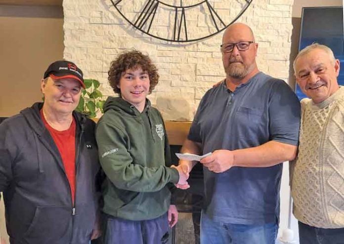 President of the Lindsay Road 20 Ratepayers Association, Brad Glofcheski, presented a check of $2,000.00 to guest speaker Myles Gambacort for the Bruce Peninsula District School (BPDS) Outers Program.