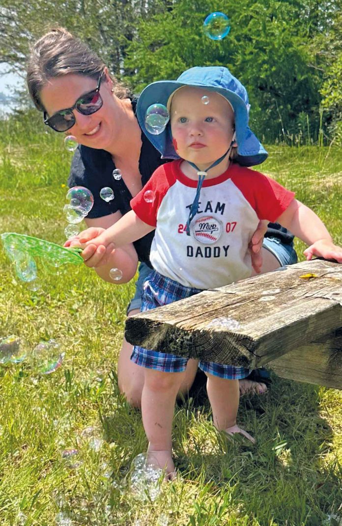 Kendra and Ian Stewart enjoy the bubble station at the Pike Bay Canada Day event in 2024.