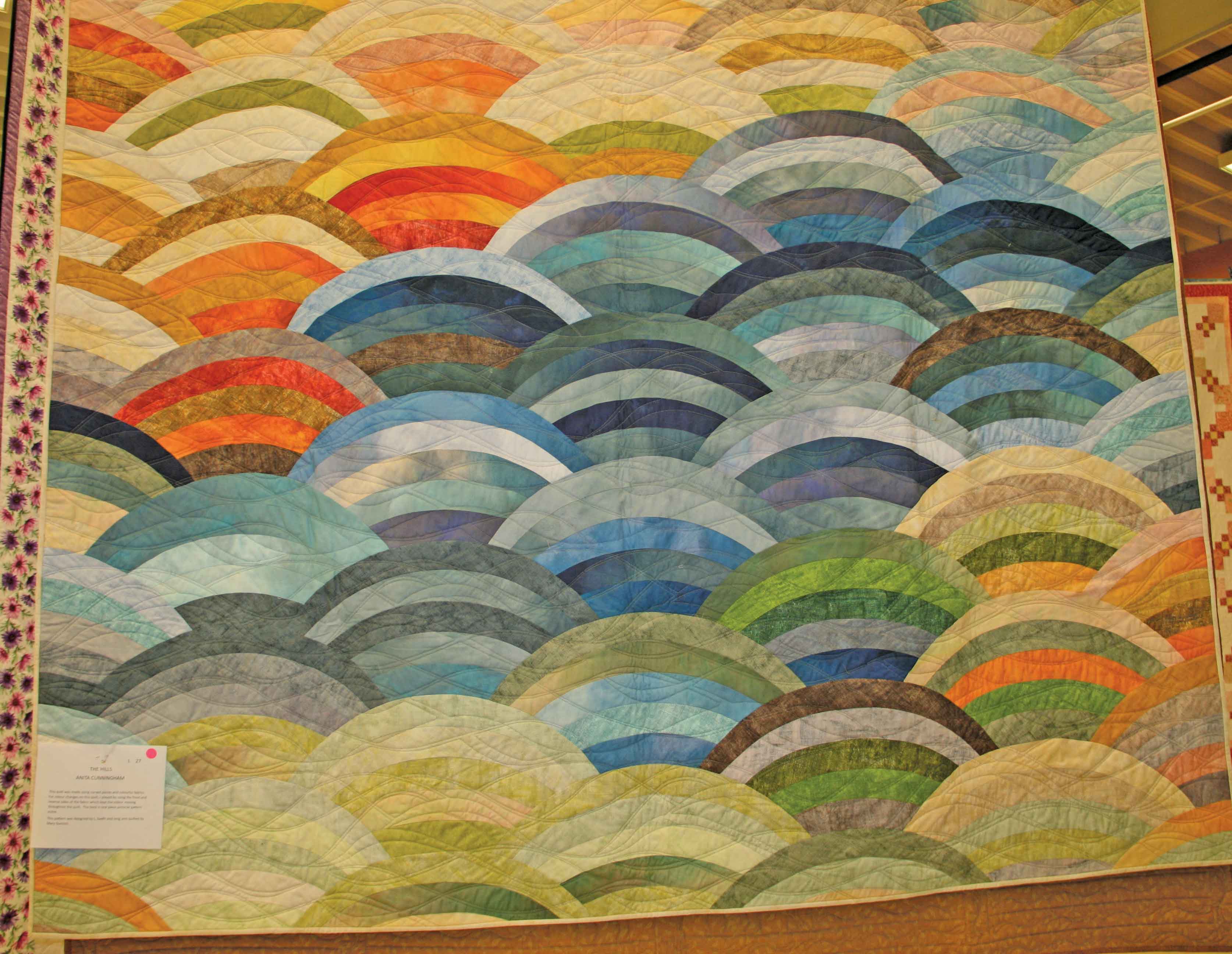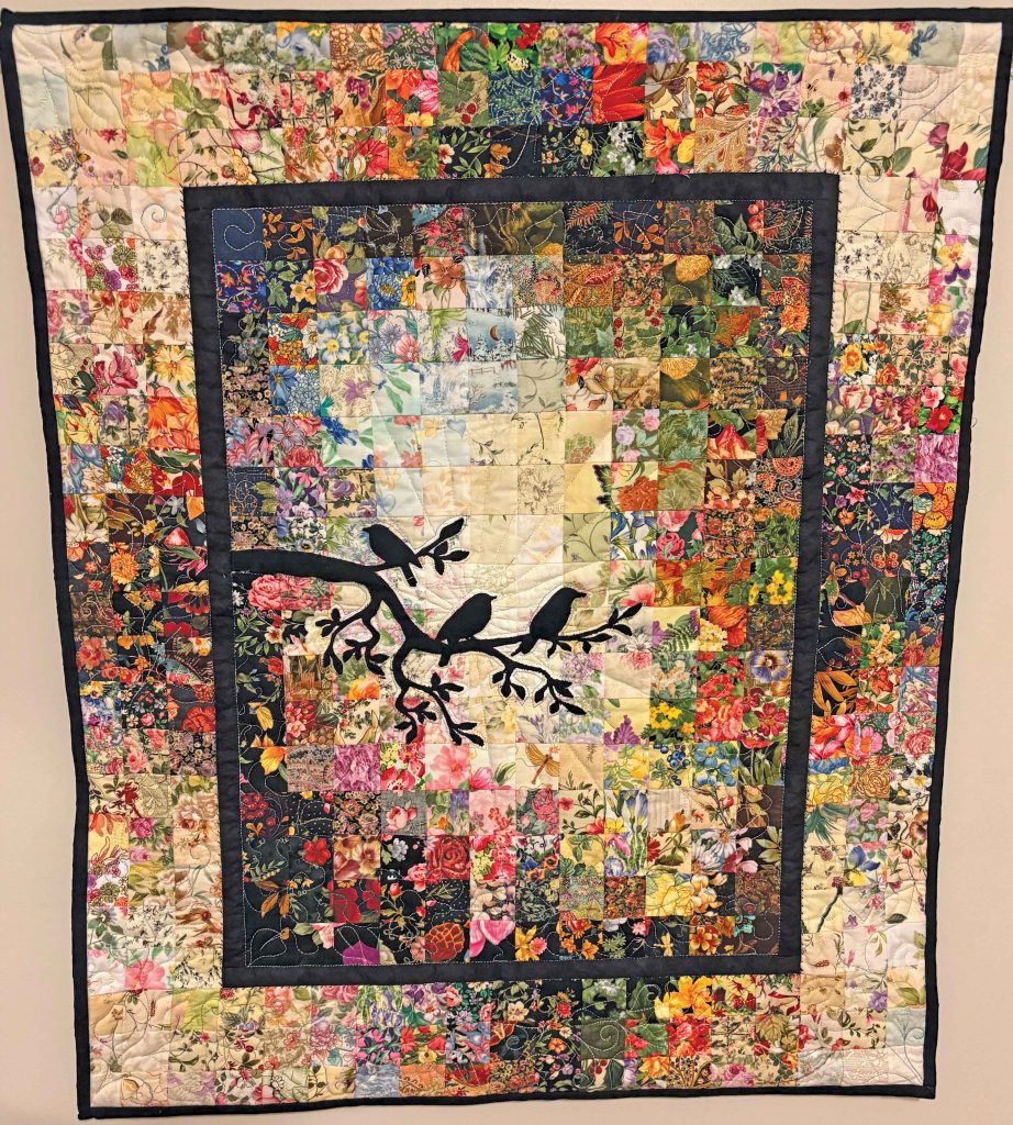 Mary hand-quilted her piece and carefully appliquéd each flower she designed. Her use of fabric creates an ombré effect, gradually blending from light to dark, adding movement and depth.
