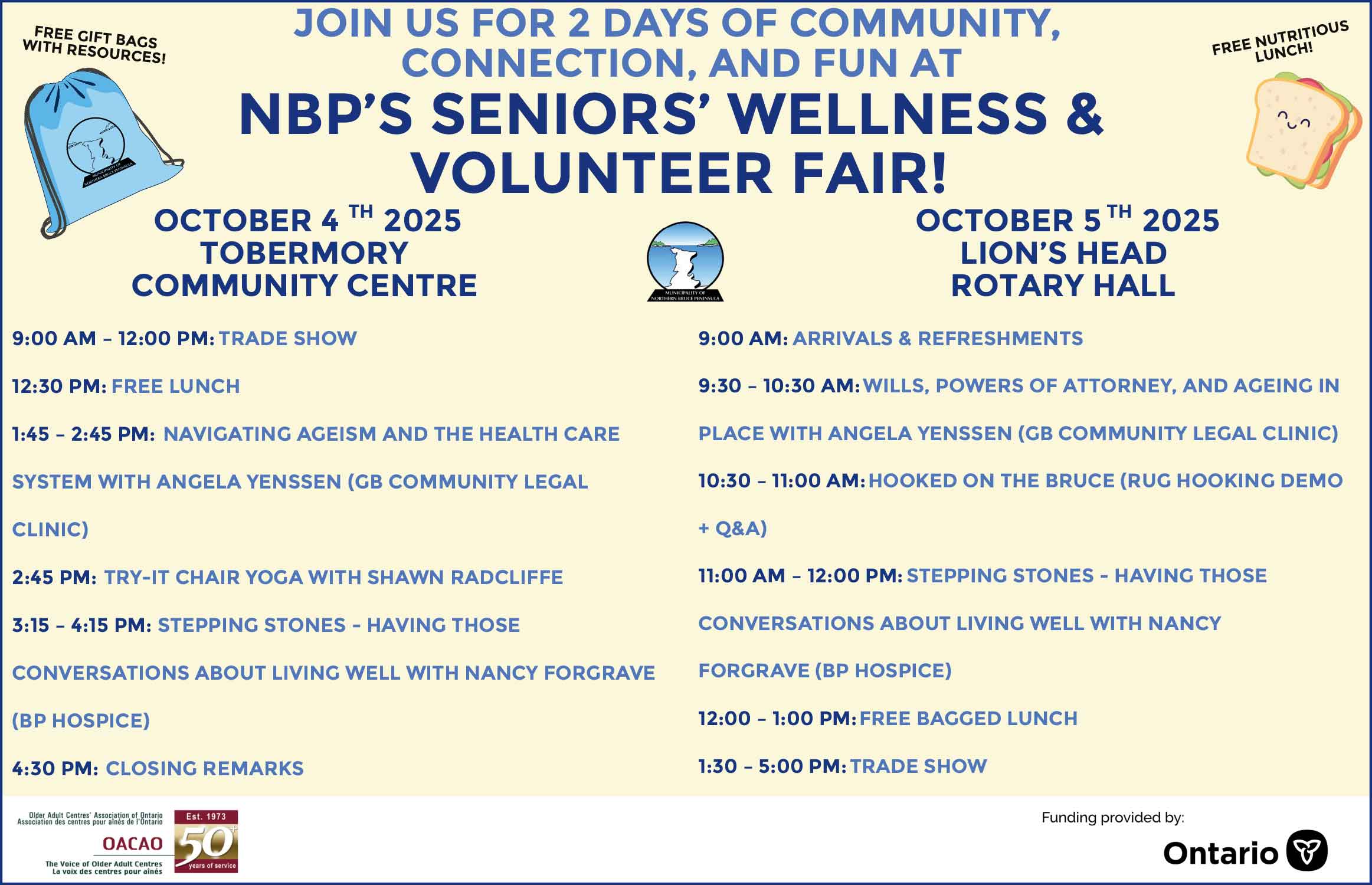 Each day will feature a lively trade show of local exhibitors, free nutritious lunches, interactive workshops, and complimentary bags filled with swag and resources from participating organizations. Community groups and organizations including Bruce Men’s Shed, Tobermory Legion, Escarpment Heights Apartments, the St. Edmunds Museum Volunteer Team, Tobermory Health Services Auxiliary, Grey Bruce Health Services, and many others will share information, offer support, and highlight opportunities to get involved.