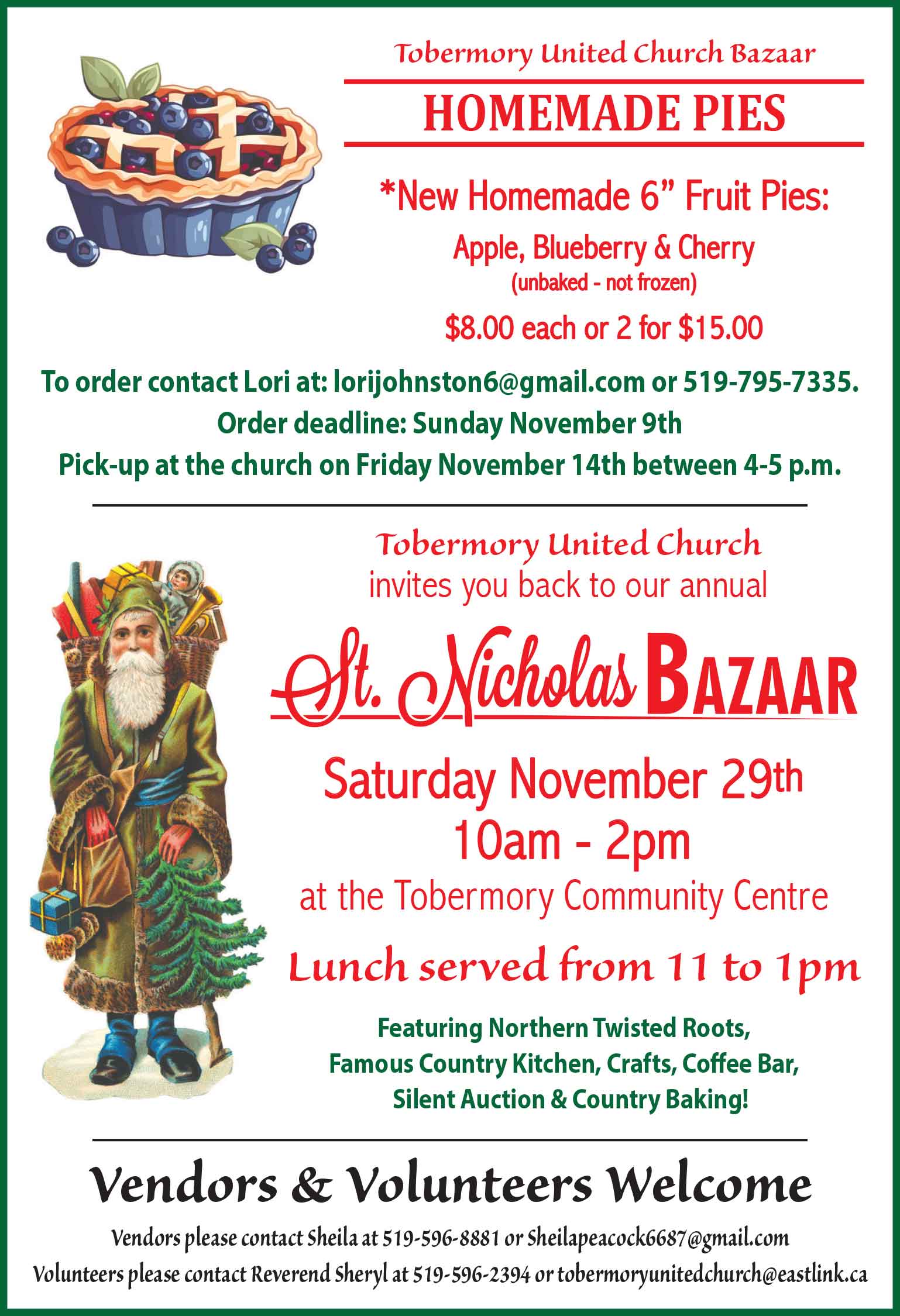 The Bazaar committee has realized that it can never re-create Vi Adams’ pies, after Vi’s passing in 2024, but the committee will, however, offer small-size homemade apple, blueberry and cherry pies that can be ordered prior to the bazaar. Call the church at 519-596-2394 to place an order. Those who are crafty are welcome to offer their creations – cards, decorations, stained glass, woodwork, etc. – for donation to the bazaar, and bakers are welcome to donate baking for sale, with the favourites being brownies, homemade bread and preserves.