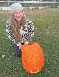 Photo: Cheryl and John, who came early to get back home in time to watch the game, pose with a supportive “Go Jays’ carved pumpkin.