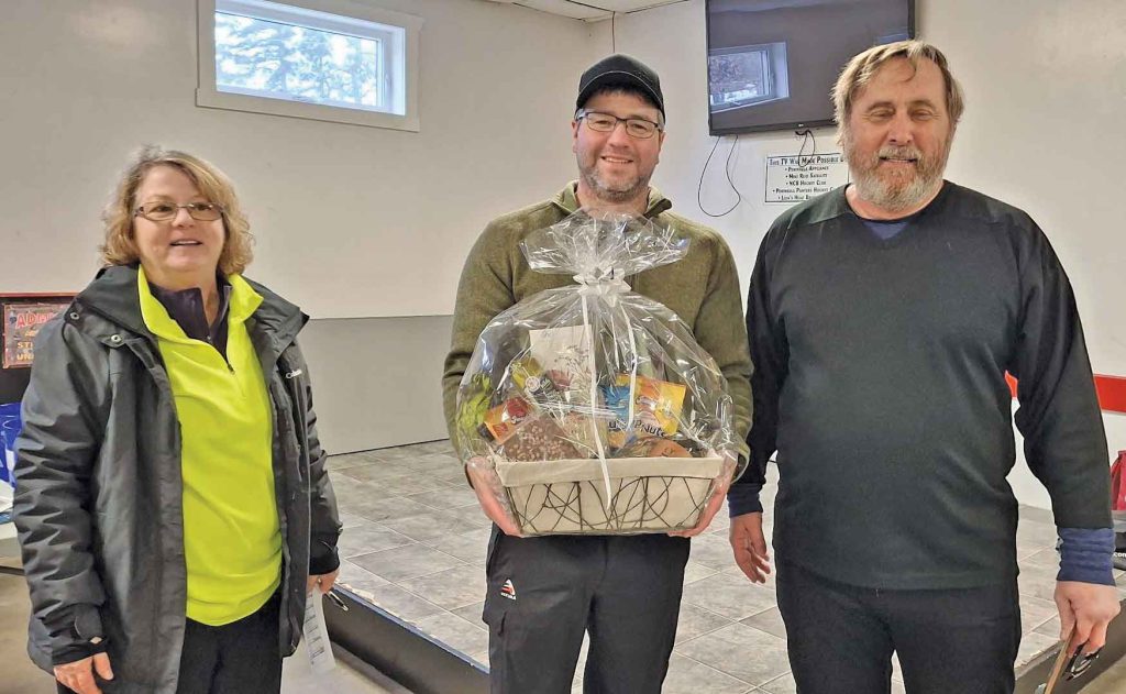 Photo: Turkey Shoot Winner Dave McInnis (center), presented by Club President, Brenda Nelson (left) and Bonspiel Co-ordinator, Jim Williams (right).