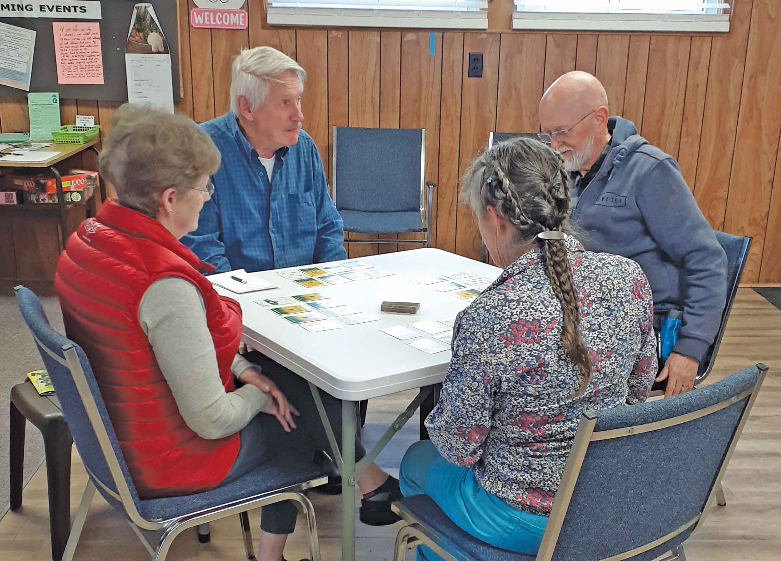 Photo: Mark, Will, Martha and Grace tackling a new game — learning the rules and enjoying the challenge!
