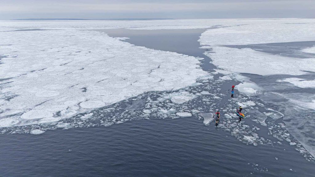 Hauling two hundred pounds each, including winter camping supplies, freediving gear, and safety equipment, the trio relied on a hybrid travel system combining modified stand-up paddleboards (SUPs) mounted on ski-sleds combined with mountaineering techniques to traverse mixed ice conditions and open water. The successful crossing was the result of more than a decade of preparation, systems refinement, and daily monitoring of ice and weather conditions.