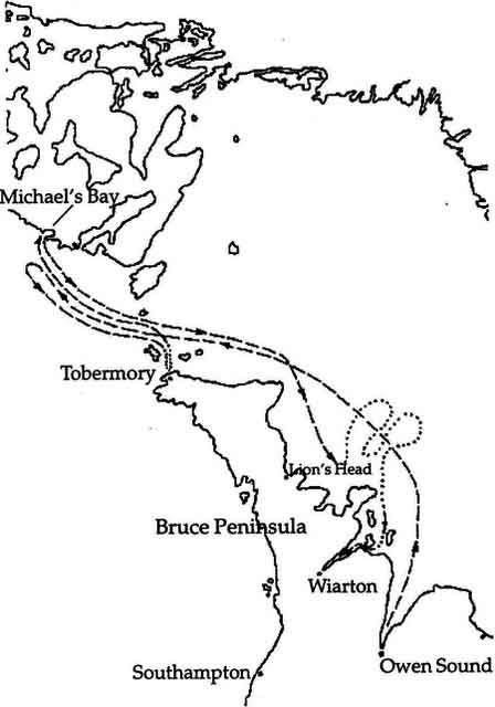 The next four days were spent trying to break the Prince Alfred from her frozen prison, but to no avail. In the meantime the frustrated Mr. Lyon, MPP, took a small boat, intending to cross over to Manitoulin. He got as far as Cove Island, then, judging the rest of the voyage too hazardous, gave up. With no possibility of getting out on the Prince Alfred, Lyon started south by land and on the 13th, after a two-day trek, reached Owen Sound. On the 15th he arrived in Gravenhurst by train, then Parry Sound by stagecoach. Ahead lay a journey by dog-team, horse-drawn sleigh and on foot, through Collins Inlet, Killarney, Manitowaning and finally home to Michael’s Bay, on the 21st.