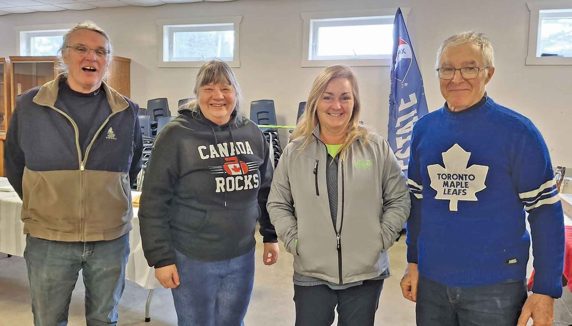 Photo: Winning team of the February 28th Bonspiel skipped by Doug Hill. (L-R) Reuben McMurter, Coralie Jacobi, Kim Pitblado and Doug Hill.
